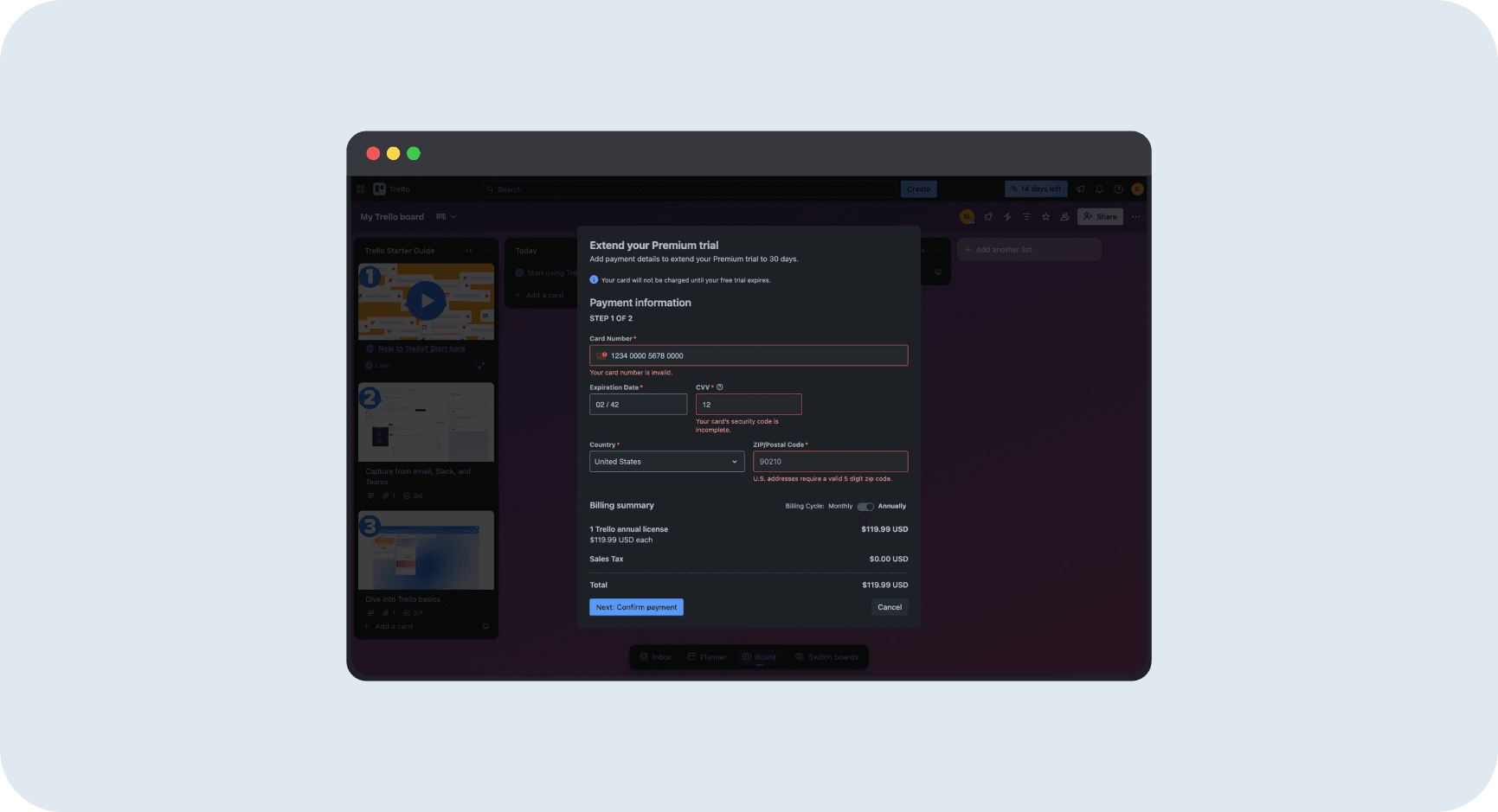 Trello doesn't say "invalid input" and leave users guessing. Each error specifies what's wrong: incomplete, not just invalid. The CVV error doesn't say "wrong CVV," it says "incomplete," which tells the user they need more digits. The ZIP error teaches the format: "valid 5 digit." Users know exactly what to fix. No guessing. No re-entering everything. Just fix the red fields.