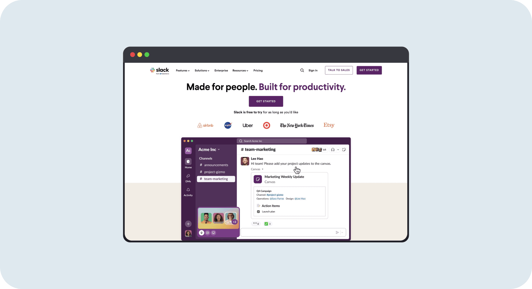 Slack uses "Made for people. Built for productivity." The headline splits into two parts: "Made for people" (human-centered design) and "Built for productivity" (business outcome). Below that: "Slack is free to try for as long as you'd like" removes time pressure. Logos from Airbnb, NASA, Uber, Target, NYT, and Etsy provide massive social proof. The product screenshot shows the actual interface with channels, DMs, and collaborative features.