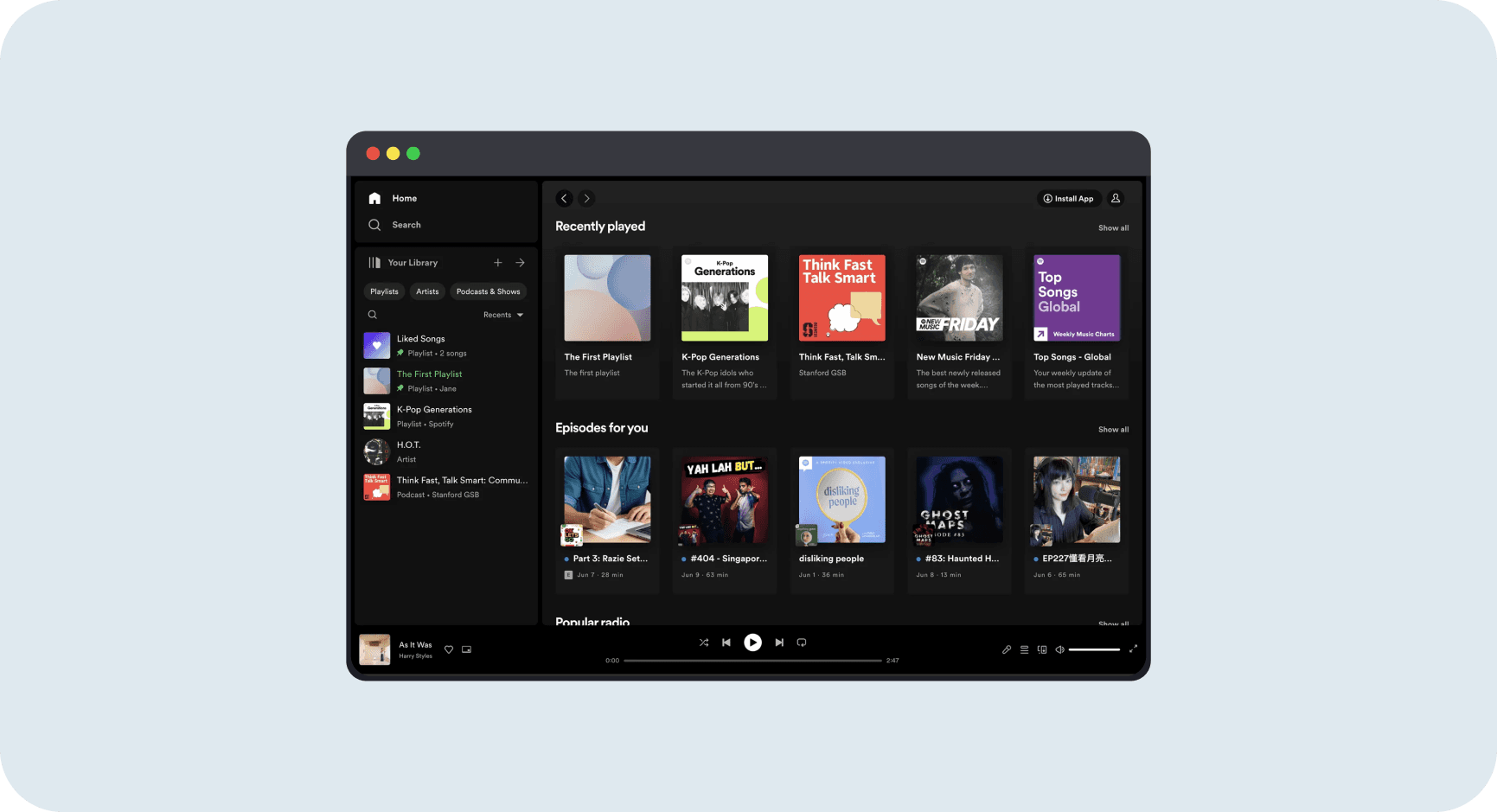The sidebar grows with you without punishing you. Week one with 3 playlists? Clean and simple. Year three with 300 playlists? Still navigable through search and filters. The persistent structure means muscle memory builds over time:Home is always top-left, your content is always in the middle, playback controls always at bottom. This consistency turns navigation into habit. Users stop thinking about "where to click" and start thinking about "what to play."