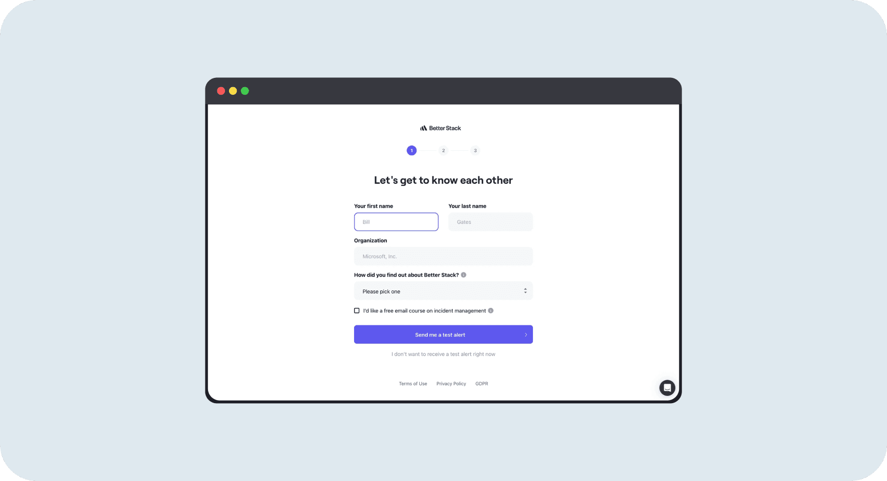 Better Stack's onboarding form collects user info (name, organization, source) with a large purple primary button at the bottom: "Send me a test alert" with a forward arrow icon. Below it, centered and styled as gray text: "I don't want to receive a test alert right now." The primary button dominates visually. The secondary option is present but clearly subordinate in size, color, and weight.